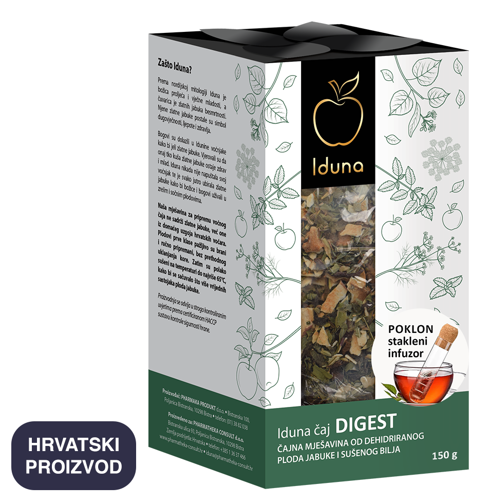 by IdunaIduna DIGEST je čajna mješavina od dehidriranog ploda jabuke i sušenog bilja. U sastavu čaja prevladava sušeni plod domaće jabuke, koji čini polovinu sastojaka. Biljne vrste koje se sljubljuju s okusom i mirisom jabuke pažljivo su izabrane, zahvaljujući spoznajama o tradicionalnoj primjeni za poboljšanje probavnih funkcija. Upravo jabuka, ponekad gorkim i manje ukusnim biljnim vrstama, daje prirodnu slatkoću te punoću okusa i mirisa.