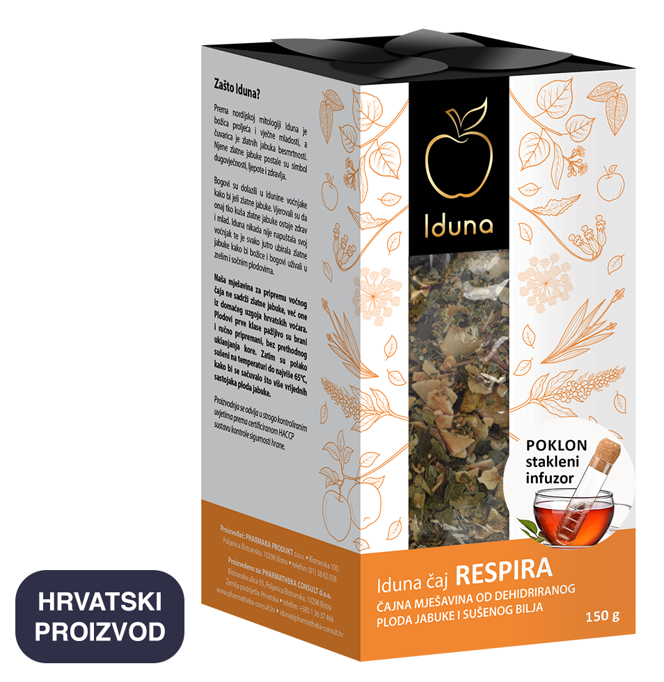 by IdunaIduna RESPIRA je čajna mješavina od dehidriranog ploda jabuke i sušenog bilja. U sastavu čaja prevladava sušeni plod domaće jabuke, koji čini polovinu sastojaka. Biljne vrste koje se sljubljuju s okusom i mirisom jabuke pažljivo su izabrane, zahvaljujući spoznajama o tradicionalnoj primjeni za poboljšanje funkcije dišnog sustava. Upravo jabuka, ponekad gorkim i manje ukusnim biljnim vrstama, daje prirodnu slatkoću te punoću okusa i mirisa.